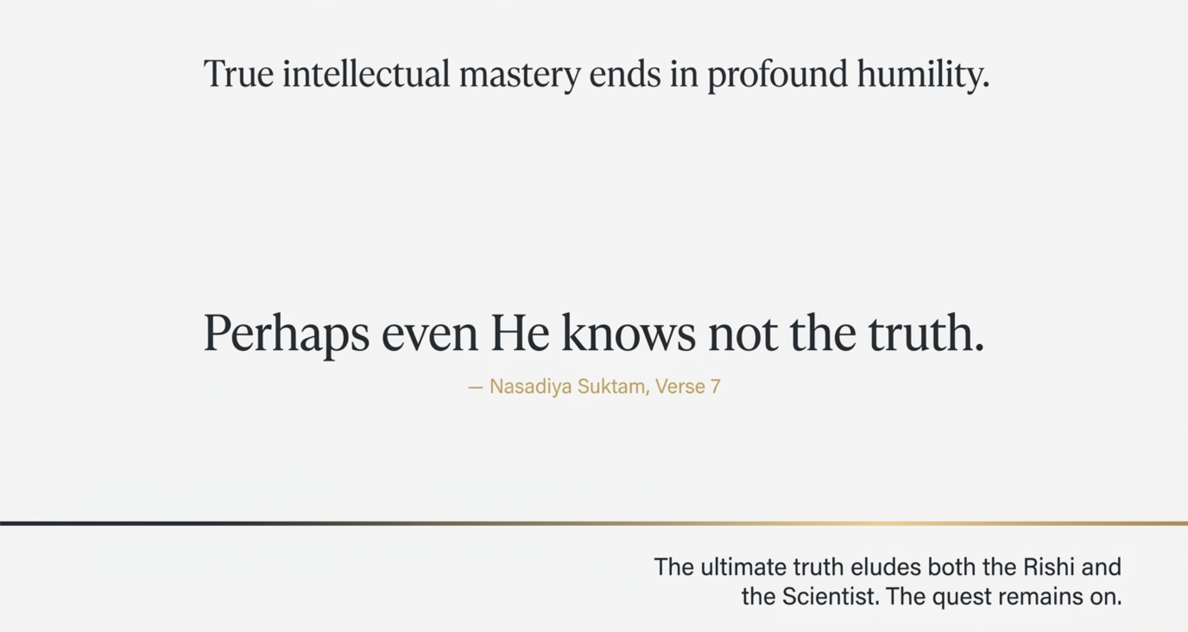 By embracing the possibility that the truth may be elusive, the Nasadiya Suktam allows the human spirit to continue its exploration of the cosmic mystery indefinitely, forever seeking the spark of intelligence that lies at the heart of existence.