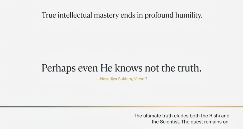 The “great quest” initiated by the Nasadiya Suktam remains an open-ended journey. By tracing the arc from the primordial cosmic ocean to the spark of Kama, and finally to the light emerging from the darkness, the hymn provides a narrative that celebrates the limits of human knowledge. Its most profound contribution is the elevation of “doubt” over “dogma.” By suggesting that even the highest intelligence may not possess the absolute truth, it ensures that the search for understanding remains an eternal, ongoing endeavor.