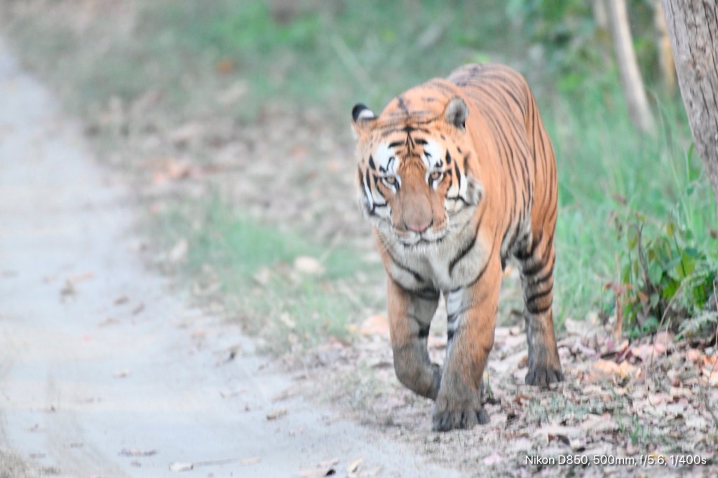 - Frame 2: A tiger striding across a sandy path, its piercing eyes and striped coat in stark clarity while the background softens into a muted haze, captured with my Nikon D850 at 480mm, f/5.6, 1/1000s. This moment taught me how even in the wild, untamed chaos of life, we can isolate a single point of awe.