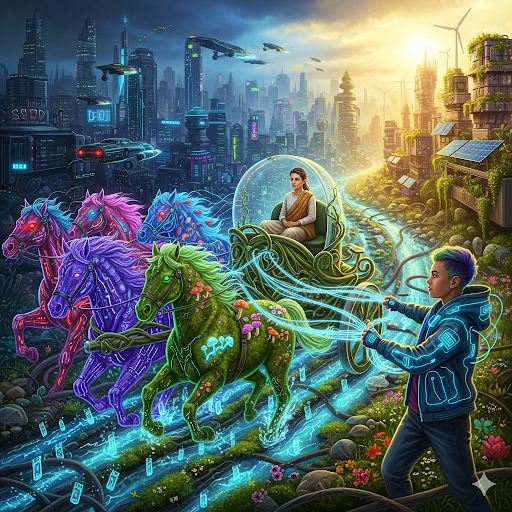 The following narrative operates as a contemporary allegory, synthesizing Vedic philosophy with cyberpunk tropes to critique the socio-technological landscape facing Generation Z. Key themes include: