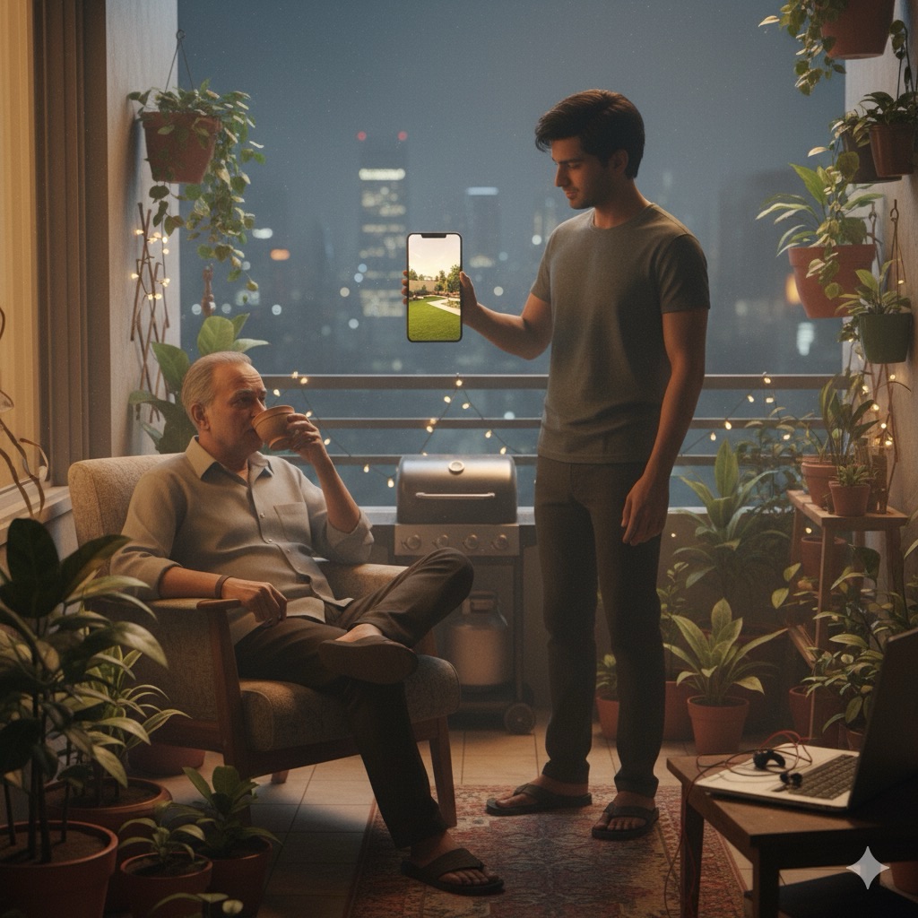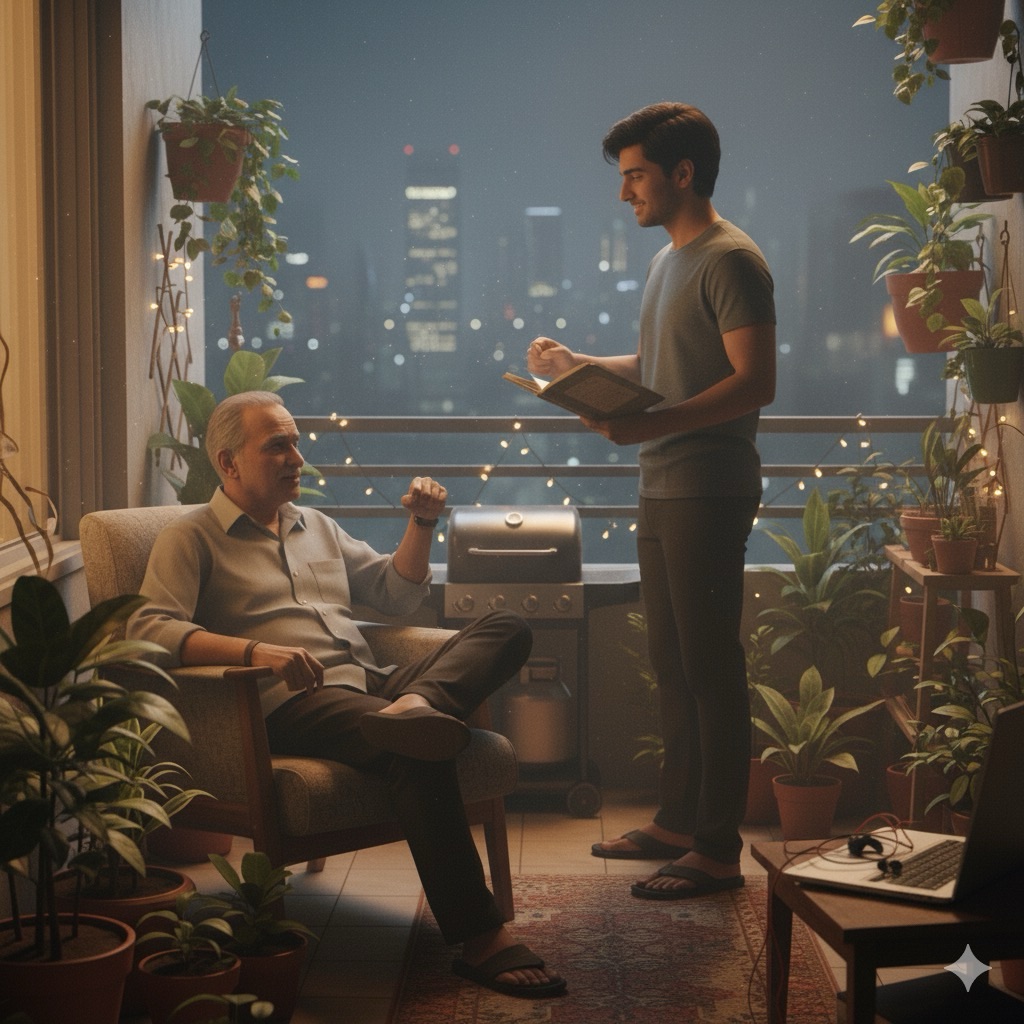 That sticky evening, as the sun melted into the Arabian Sea, Aryan found Raj on their cluttered balcony, sipping chai and gazing at the twinkling city skyline. Raj, the poet in his late 50s with salt-and-pepper wisdom etched into his face, looked up with a warm smile. Aryan thrust the notebook forward. “Dad, I found this,” he said, voice edged with hype and hesitation, pulling up his phone to scroll through pics of his uncles’ Cali lives—Uncle Vik grilling in a sprawling backyard under palm trees, Uncle Samir hiking a sun-dappled trail with his dog, their faces relaxed in a way Aryan envied. “Your poem nails it—the garden calling. I need that life, like Uncle Vik and Samir. They ditched the grind here for real quality vibes: no family drama chaining you, safe parks to vibe in, building on your terms. But what if I can’t hack it? That $100K H-1B fee Trump dropped yesterday? Tariffs spiking costs? Door’s slamming, and stakes are massive—if I stay, I’m ghosting my potential; if I leap and flop, I’m done. It’s not just tech; it’s the lifestyle—merit-based wins, no cultural baggage slowing you down. Uncles say it’s like upgrading your OS: smoother, freer, with space to reinvent without the old norms dragging.”