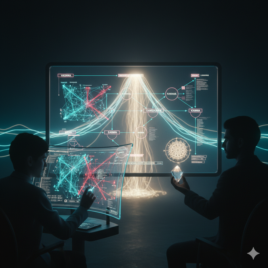 Rohan: “Let’s use your analogy. You said the ‘algorithms’ control you. But what is an algorithm? It’s a patterned instruction. A habit. Here, it’s your Vasanas.” He smoothly walked to the whiteboard, picked up a dry-erase marker, and drew a single, elegant loop: [PAST COMMIT] → [SAMSKARA (Code Pattern)] → [VASANA (Algorithm)] → [WRITES NEW CODE (Karma)] → [NEW COMMIT] “You see? You feel controlled because you’re operating on autopilot-merge. The CI/CD pipeline—the law of Karma—sees your thoughtless commit, runs its tests, and automatically schedules a new build for a new market. You get stuck in a loop: v3.2.2, then v3.3.0, and before you know it, you’re debugging v4.0.0… forever.”