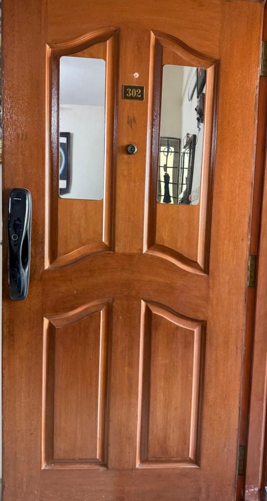 I looked at my door. There was a narrow, polished mirror panel embedded in the wood.
