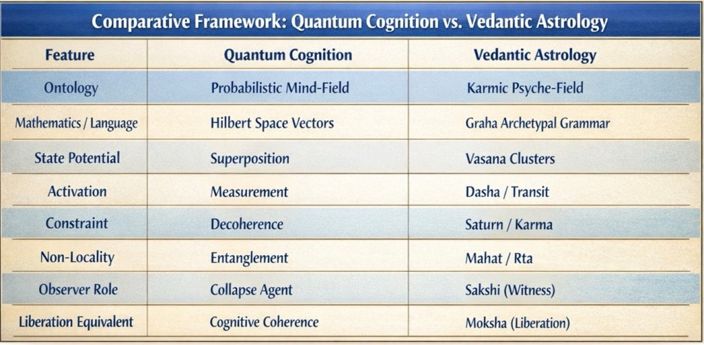This paper investigates the structural isomorphisms between Quantum Cognition—the application of non-commutative mathematical formalisms to human decision-making—and Vedantic Astrology (Jyotisha)—a traditional Indic system for mapping the “karmic probability” of psychological states. Rather than asserting a physical identity between subatomic particles and planetary bodies (a common category error), this inquiry focuses on their shared Non-Newtonian logic. By analyzing how both frameworks utilize field-based ontologies, state-superposition, and context-dependent “collapse,” we argue that Jyotisha functions as a proto-quantum model of the psyche, offering a symbolic technology for navigating an indeterminate reality.