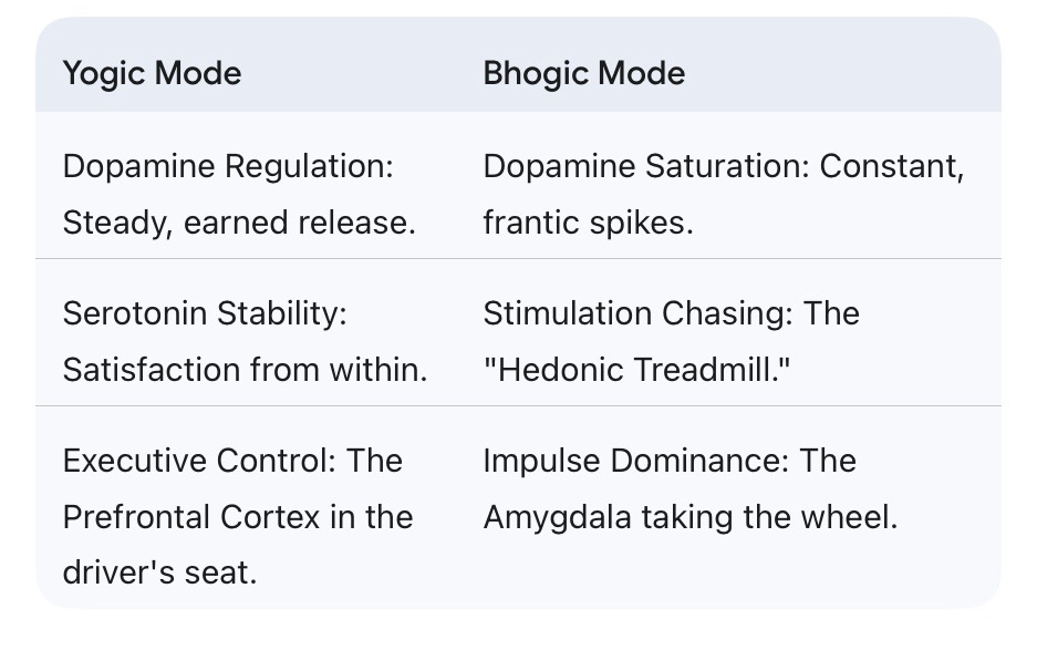 We are the first generation to live in a world where the Bhogic OS is the “Factory Setting.” Algorithms are engineered to bypass the Yogic firewall. Infinite scroll, on-demand dopamine, and digital comparison loops have made us powerful but brittle. High performance, zero shock absorption.