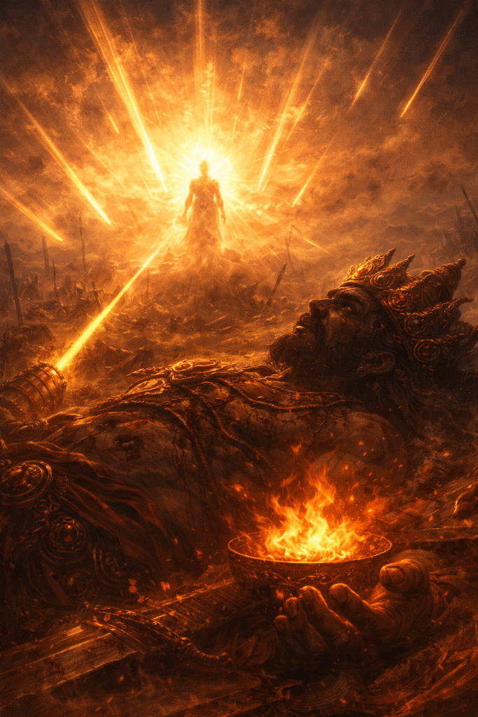 Ravana lifted a trembling hand, pointing toward the horizon where the physical sun met the spiritual one. “My fall is no longer a defeat. It is a bowl of fire… offered to the Source.”