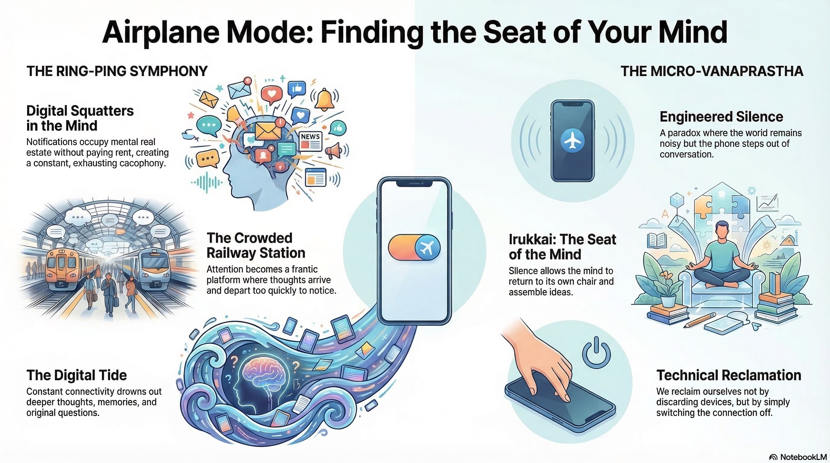 In ancient Indian philosophy, Vanaprastha is the stage of life where one withdraws from worldly noise to seek reflection. Airplane Mode is perhaps our accidental, digital version of this. It is a “Micro-Vanaprastha”—a retreat that requires no forest, only a thumb and a screen.