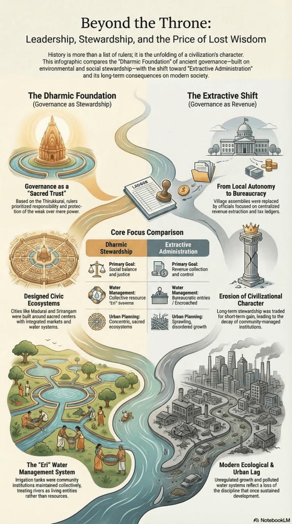 Instead of long-term civic stewardship, administration increasingly centered around revenue extraction and centralized control. Systems that had once been maintained locally — temple lands, irrigation networks, village councils — became bureaucratic entries in tax ledgers.