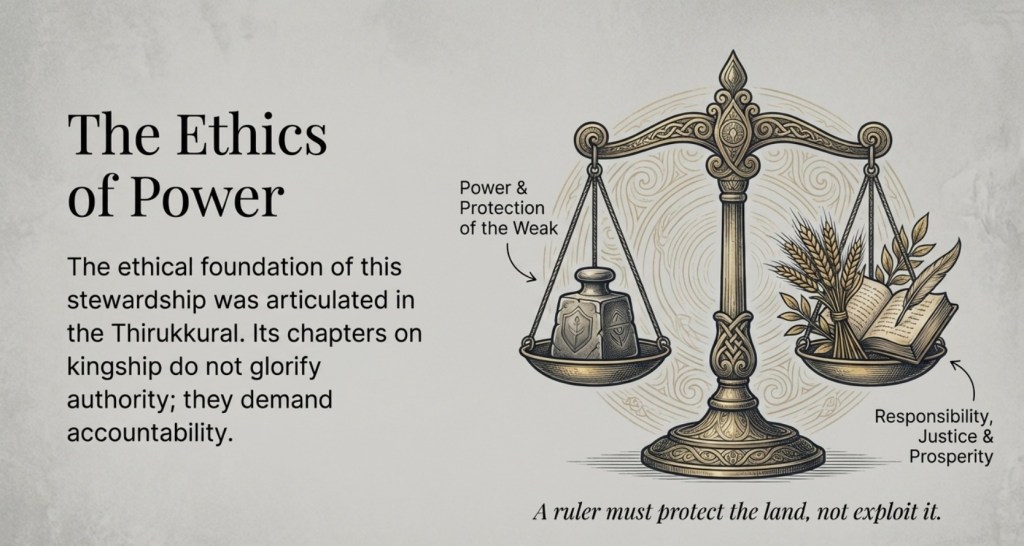 The Thirukkural’s chapters on kingship do not glorify power. Instead, they emphasize responsibility. A ruler must protect the weak, uphold justice, and ensure prosperity for the land and its people.