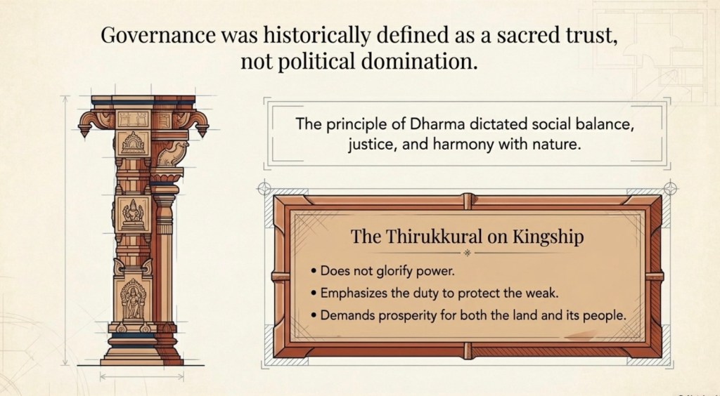 Across ancient Tamilakam and much of the Indian subcontinent, governance was not just political authority. It was deeply tied to dharma — the principle of maintaining social balance, justice, and harmony with nature.