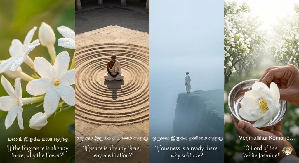 If the fragrance is already there, why the flower? If peace is already there, why meditation? If oneness is already there, why solitude? O Lord of the White Jasmine! (Vēṇmallikai Kōmānē)
