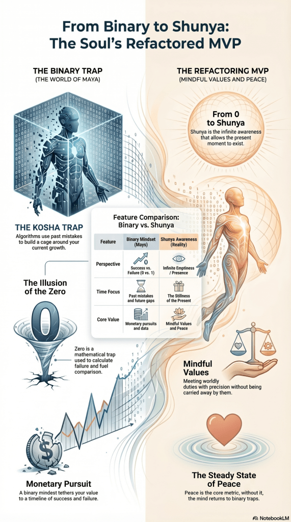 The algorithms of the world are built on these 0’s. They use your past “zeros”—your mistakes, your old conversations, and your perceived gaps—to build a cage around the “Newer You.” This is the “Kosha Trap.” It convinces you that you are a collection of binary data, a “Monetary Value pursuit” tethered to a timeline of success and failure.